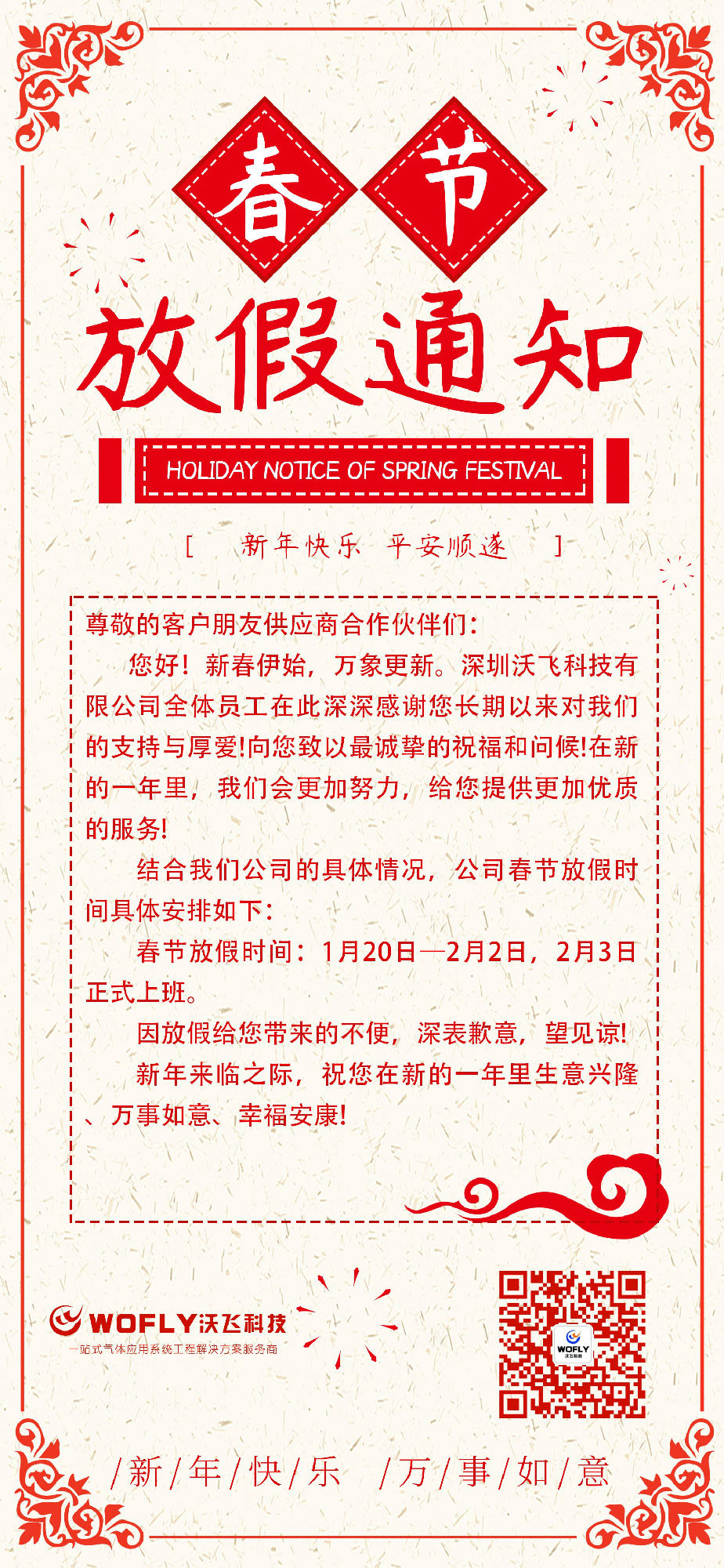 深圳沃飛科技有限公司關于2020年春節放假安排通知
